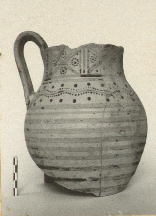 | Description: | Base and lower part of body missing. Wide round mouth. Flat handle. On mouth a series of square panels decorated with crosses and dot rosettes; one panel, on right side, has a duck in silhouette, with dot rosettes. On shoulder, a wavy line with row of dots on either side; then larger dots. Body with horizontal stripes. Handle has square panels with stars. Pinkish-buff clay; glaze black to brown, worn. | |