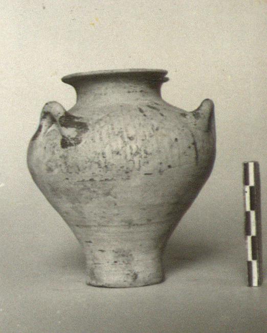 | Description: | One handle and fragments of lip missing; base cracked. Flatish rim, horizontal handles round in section. Crisscross pattern on shoulder, bordered by glaze bands. Lower part, mouth and handles covered with paint. In the pot, some scraps of bone and carbonized matter. Yellow-buff clay; very dark brown to black matte paint, much worn. | |
