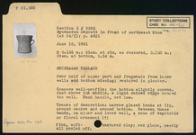| Description: | Over half of upper part and fragments from lower walls and bottom missing; restored in plaster. Concave wall profile; the bottom slightly convex. Just above the middle, a light raised ridge around the wall. Band handle, set low. Traces of decoration: narrow glazed bands at lip, around center and around bottom. Between these bands, on upper and lower wall, a zone of vegetal or floral ornament(?). Pink, soft clay; red glaze, nearly all peeled off. | |