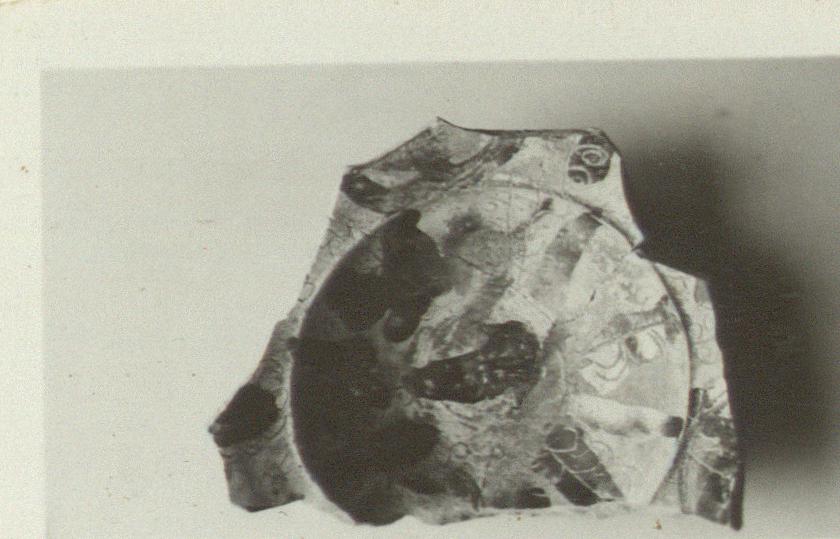 | Description: | Entire edge of rim missing and some of body. Low ring base; off-set rim. Decoration in blobs of green and brown and in elaborate but crude sgraffito. White glaze, much discolored. | |