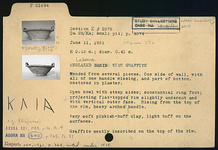 | Description: | Mended from several pieces. One side of wall, with all of one handle missing, and part of bottom. Restored in plaster. Open bowl with steep sides; substantial ring foot; projecting flat-topped rim slightly undercut and with vertical outer face. Rising from the top of the rim, heavy arched handle. Graffito neatly inscribed on the top of the rim: <graphic> Very soft pinkish-buff clay, light buff on the surfaces. | |