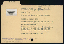 Description:   Mended from many pieces; part of one side with one vertical lug, part of one handle and of base missing. Typical shallow brazier on flaring stand; broad rim with vertical lugs for spits; handles round in section set below rim. Four rectangular holes cut in stand.