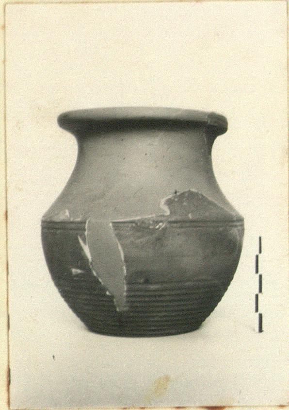 | Description: | Fragmentary; profile complete except in neck; lower handle attachment preserved. Restored in plaster. One-handled jug with convex body, offset concave shoulder and wide neck and mouth. Horizontal grooves below shoulder and on lower half of body. Shape as P 10165. Red micaceous clay, rather soft and brittle. No glaze. | |
