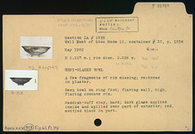 | Description: | A few fragments of rim missing; restored in plaster. Deep bowl; ring foot; flaring wall; high, flaring concave rim. Reddish-buff clay, hard. Dark glaze applied inside and spilled over part of exterior; red, mottled black in part. | |