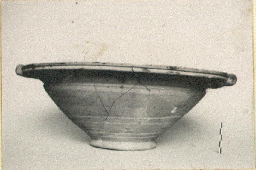 | Description: | Fragmentary; profile complete; plastered. Deep bowl; ring foot; flaring wall; everted rim and overhanging lip grooved on top and outer edges; two horizontal handles applied flush to lip. Hard, coarse, buff clay. Dull glaze applied in swirls in exterior, red and mottled black. | |