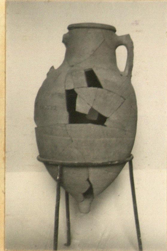 | Description: | Mended from many fragments, one handle missing. Ovoid amphora; short wide neck; rolled lip; horned handles; short toe. Dipinto on shoulder, painted in black: <graphic> Hard pinkish-buff clay with bits. | |