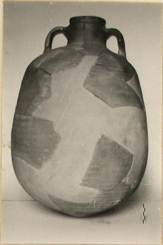 | Description: | Bottom and fragments of body missing. Restored in plaster. Cylindrical amphora with rounded bottom and protruding toe(?). Shoulder rounds over to a short neck with thickened lip. Short vertical handles. Body with wheel ridges, shoulder marked with broad grooves. On shoulder a graffito: <graphic> Pinkish-buff clay with bits, slightly micaceous; self surfacing. | |