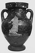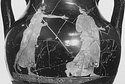 Below each figured scene, stopped maeander punctuated by cross squares; tongues at the base of each handle. The glaze is much worn and chipped around rim and neck of reverse. The interior is thinly coated with brownish glaze.