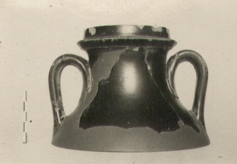 | Description: | Several fragments preserve rim, neck, both handles, and part of shoulder. Rim flanged for lid. Handles segmental in section, rooted in shoulder and base of neck. Dull black glaze on extant portions of exterior and on interior of neck; interior of body brown to black. Cf. Agora XII, no. 25. | |
