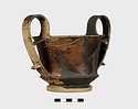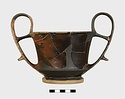 | Description: | More than half complete; missing fragments of body, rim and handles. Restored in plaster. Foot in two degrees, the lower disc-like, the upper spreading; the angle at which they meet is an echo of that in the walls above; flat resting surface; inner face of foot slopes up steeply to meet underside of floor, which is convex. The body consists of a short spreading lower wall and a slightly concave upper wall that join to form a sharp keel from which the handles spring. The outer edge of the rim is slightly rounded. Strap handles, rising in a loop above the rim. There is a cross-piece between rim and handle, and a finger rest on the outside of each handle near its lower attachment. Thin fabric. Black glaze inside and out except as follows: the lower degree of the foot is reserved as well as the resting surface; inner face of foot glazed but underside of floor reserved and bears two concentric glazed bands. The glaze fired brownish-black to dull red, peeled in places, particular on one handle. . | |