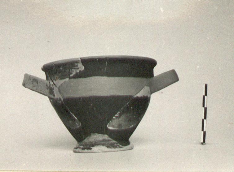 | Description: | About half preserved, including the base, one handle, and part of the rim. Restored in plaster. Spreading foot, roughly scored along the outside (as if from careless potting); resting surface and inner face are continous but irregular, varying from convex to sloping; underside of floor recessed and convex. Flat rim, projecting outwards. Horizontal strap handle, sharply uptilted. Along the fractures the fabric is usually a greenish-gray. The glaze fired variously dull gray, dark brown, and red, and some peeled. A reserved band around the exterior at the level of the handles. The bottom edge of the foot is reserved and there is a reseved band around the outer edge of the underside of the floor. Otherwise glazed over all with the possible exception of the flat rim. Subgeometric survival. | |