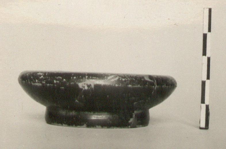 Description:   Three fragments preserve almost all the original. Ring foot, narrow resting surface, inner face convex. Thick walls. Rim rounded at the edge. Black glaze, except on resting surface of foot and underside of floor, which are reserved and reddened. The latter also bears a mutilated graffito.