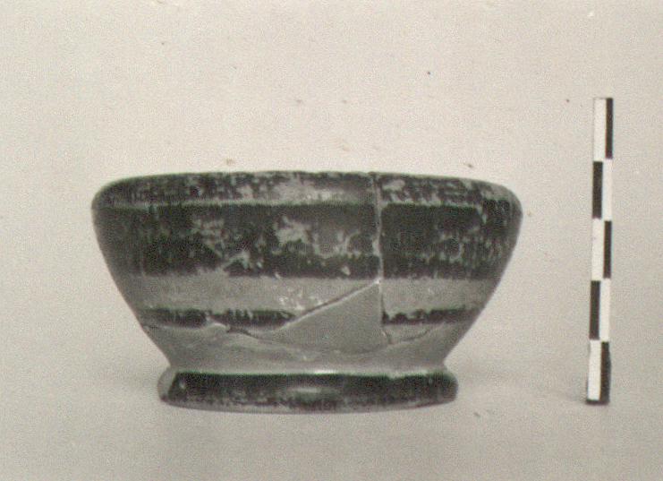 | Description: | Missing a few fragments from walls and rim. Resting surface continuous with underside of floor, which is concave. Rim rounded at the edge, slightly incurving. Black glaze on interior, upper part of exterior, and ring foot. Lower half of exterior is reserved and bears a glazed band about half way down. Underside completely reserved. | |