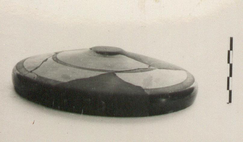 Description:   Over half preserved; the knob is missing. Restored in plaster. Domed lid, rounded at the edge to form a plain rim. Thickening at root of knob. Interior unpainted. Exterior in black glaze, with two reserved bands, a narrow one encircling the lid halfway between knob and rim, a broader one around the top of the rim.