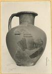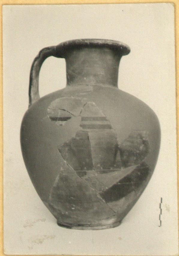 | Description: | Missing about half the body; restored in plaster. Low ring foot. Underside of floor slightly concave, its curve including the underside of the foot, i.e. the resting surface is not set off from the floor. High ovoid body. Straight neck. Flaring lip, rounded on the outside. Flat handle, rooted in shoulder and lip, and thickened at each root. Brown clay. Dark brown wash outside and perhaps also inside, certainly on the inside of the neck. Dull black glaze on lip, outside of handle, in two bands around body below level of handle, and in another band that covers the outside of the foot and the adjacent part of the body. | |