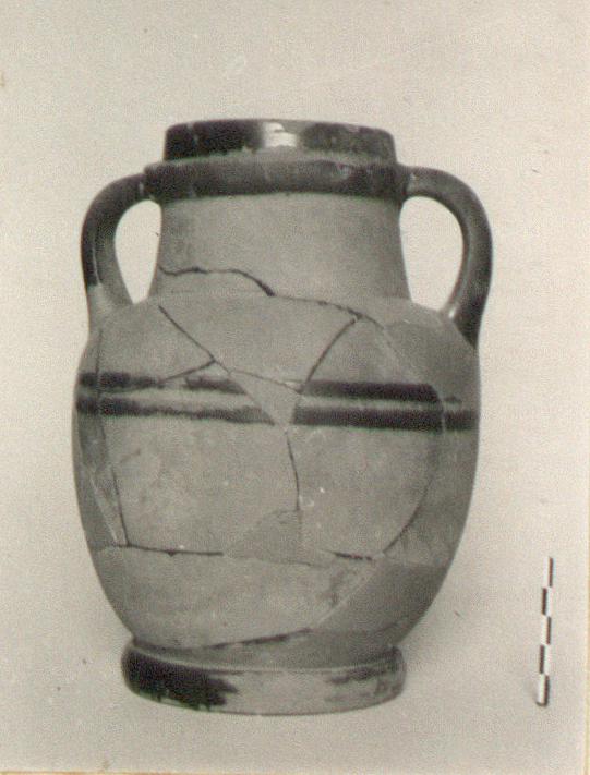 Description:   Missing fragments from body and rim. Lid not recovered. Stout ring foot, inner face rising in convex curve to underside of floor, which is flat. Body tapers toward base, but only slightly. Straight neck, clearly offset from body. The rim is thick and rounded on the outside, and flat above; around its inner edge rises a vertical flange to receive a lid. Handles segmental in seciton, rooted in shoulder and base of rim. Black glaze, occasionaly fired red, covers all the interior except for a space around the shoulder, and on the exterior on the rim, the backs of the handles, the ring foot, and in two bands around the body below the handle root. A scored line around the base of the neck shows traces of red wash, so also other scored lines around body just above foot.