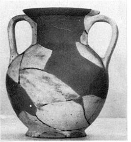 | Description: | Missing part of one handle and fragments of rim and body; restored in plaster. Spreading ring foot. Plain, slightly concave bottom. Ovoid body. Straight neck. Flaring rim, thickened on outside. Flat handles, rooted in shoulder and top of neck. Yellow clay, soft and powdery. Corinthian? | |