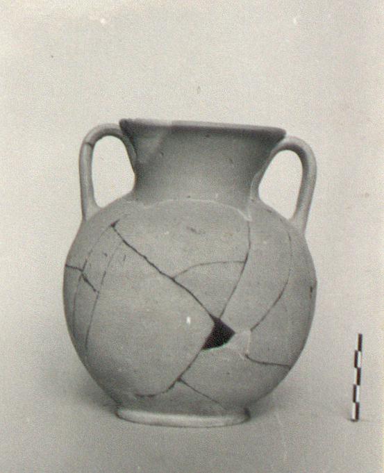| Description: | Missing fragments from rim, neck and body; restored in plaster. Low ring foot; resting surface continuous with underside of floor, which is concave towards its outer circumference, and flat or convex at its center. Round body. Flaring neck and rim, the latter set off from the former. Lip slightly rounded outside. Handles segmental in section, rooted in shoulder and neck. Hard fabric, pale yellow on surface, pink inside. Corinthian? | |
