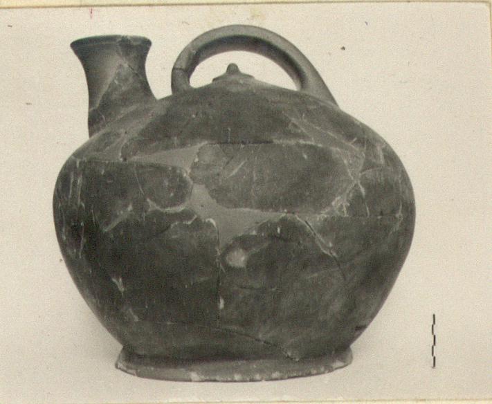 | Description: | Missing much of handle and spout, and about half the body; restored in plaster. Spreading ring foot. Body flaring below, convex above, bulging at the middle. Vertical spout, with high concave neck, bulging at its base outside. The lip flares slightly and is marked off from the neck by an incised groove. Flat vertical handle rises steeply from behind spout and falls in a gentler curve to a point on the shoulder opposite the spout but lower down than the other handle root. On the body beneath the handle is a small moulded nob with conical top, as if to suggest a lid. The illusion is reinforced by two incised grooves describing a partial circle, beginning and ending on opposite sides of the lower handle root. The grooves become indistinct in the space between spout and handle. Slate gray fabric, the surface of darker color than the interior. | |