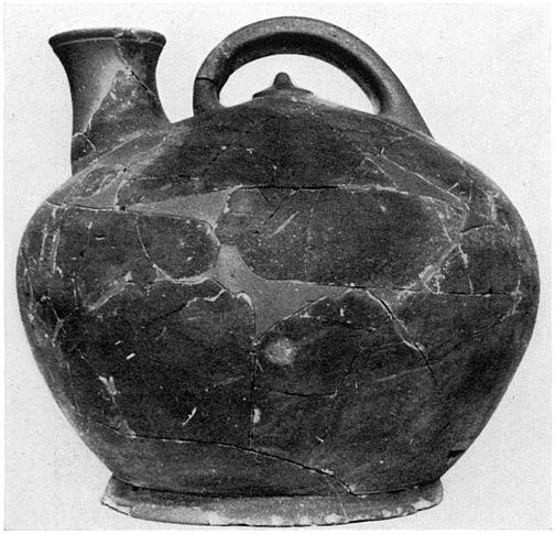 | Description: | Missing much of handle and spout, and about half the body; restored in plaster. Spreading ring foot. Body flaring below, convex above, bulging at the middle. Vertical spout, with high concave neck, bulging at its base outside. The lip flares slightly and is marked off from the neck by an incised groove. Flat vertical handle rises steeply from behind spout and falls in a gentler curve to a point on the shoulder opposite the spout but lower down than the other handle root. On the body beneath the handle is a small moulded nob with conical top, as if to suggest a lid. The illusion is reinforced by two incised grooves describing a partial circle, beginning and ending on opposite sides of the lower handle root. The grooves become indistinct in the space between spout and handle. Slate gray fabric, the surface of darker color than the interior. | |