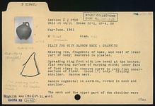 | Description: | Missing rim, fragments of base, and most of lower part of body, restored in plaster. Spreading ring foot with low bevel at the bottom; flat resting surface of varying width; inner face of foot rises in concave curve to join flat undersurface of floor. Round(?) body. Sloping shoulder. Narrow neck. Handle segmental in section, rooted in neck and shoulder. The neck and the upper part of the shoulder were thrown separately; on the exterior the juncture of the two sections results in a noticeable bulge. On the shoulder, to the left of the handle, a large and crudely incised delta: <graphic> Reddish-buff clay, with a few mica specks. | |