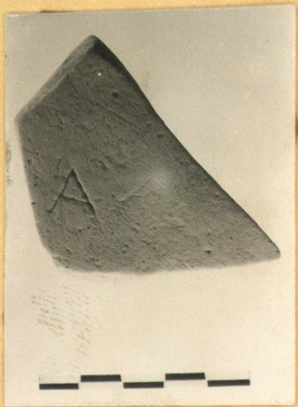 | Description: | Fragment from shoulder(?) of storage amphora. Graffito: <graphic> Buff colored clay, darker inside than out. | |