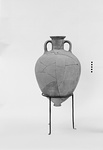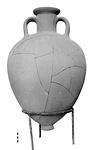 | Description: | Mended from many pieces; parts, one side, restored in plaster. Rim flat-topped, and offset from top of neck. Band handles with finger impressions on lower attachments. Body tapers to neat ring foot. Pink to buff clay, fired partly light gray. Cf. P 12760 and P 16526. | |