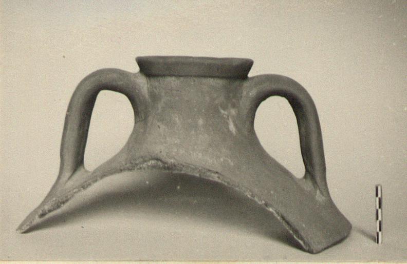 | Description: | Neck, handles, and part of shoulder, in one piece but cracked. Shape resembles P 21982, but rim distinctly offset. Micaceous russet clay with large gray core. ADDENDA P 21981: Rim inset from top of neck (effect of groove). Broad handle swinging out to lower attachments, on which small finger impressions. Body spreads from short neck. | |