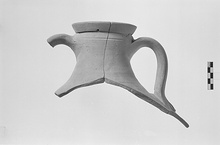 | Description: | Most of neck and part of shoulder, with one handle complete; mended from two pieces. Similar to P 21987 but more roughly made. The groove at the level of the upper handle attachments follows a swelling in the neck (cf. P 21989). Micaceous pinkish-buff clay. Cf. P 21989. | |