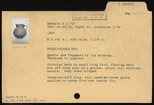 | Description: | Handle and fragment of lip missing; restored in plaster. Small ring foot; globular body; flaring neck set off from body by a groove; plain lip; vertical handle. Body wheel-ridged. Brownish-buff clay. Dull reddish-brown glaze applied to above foot and inside lip. | |
