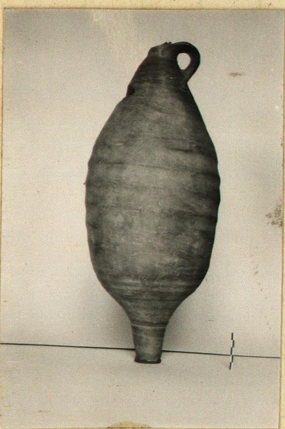 | Description: | Most of neck and resting surface of foot missing; filling hole broken in shoulder; otherwise intact. Fusiform one-handled jar of typical reddish-brown micaceous clay. Black dipinto on body below handle. | |