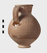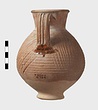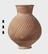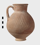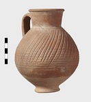 | Description: | Intact. Ring foot; globular body; high, slightly flaring neck with rolled lip; broad vertical grooved handle. Center of body wheel-ridged. Upper half of body marked with diagonal gouging which crosses over the wheel ridging. Dark pinkish-buff clay with bits. Dull brownish glaze on upper part of body. | |