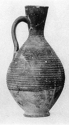| Description: | Intact except for handle and part of lip. Restored in plaster on basis of P 10484. Pear-shaped body tapering below to ring foot; high, slightly flaring neck with plain lip; single vertical handle. Four grooves around neck, just below lip. Body wheel-ridged from base of neck to below point of maximum diameter. Buff clay with bits. Dull red glaze on exterior to bottom of wheel ridging. | |