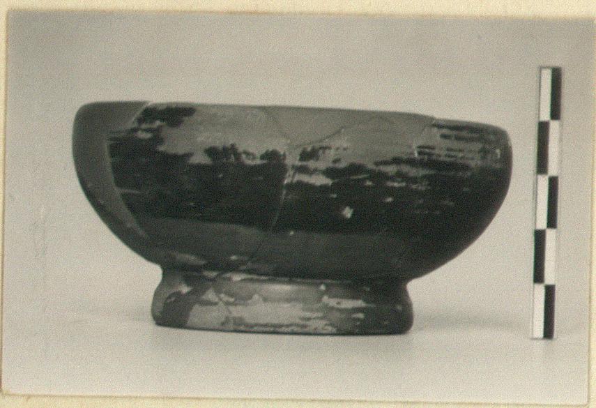 | Description: | About two-thirds of wall and rim missing. Ring foot grooved beneath; incurved rim. Red glaze except for band around outside of rim. | |