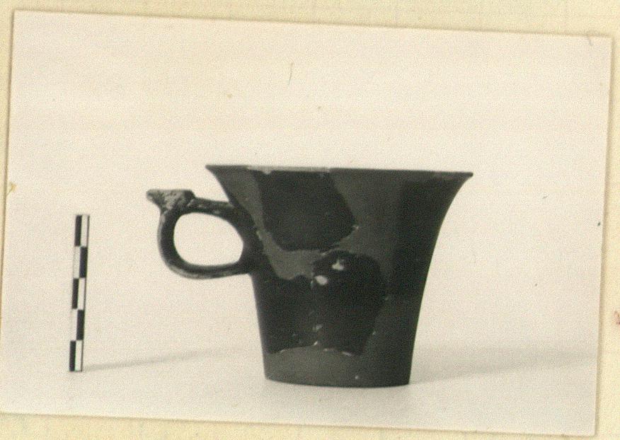 | Description: | Fragmentary; part of one side, one handle and four non-joining fragments of lip preserved; upper part restored. Very slender shape with flaring lip, drinking horn? Strap handle with ivy leaf thumb grip. Ivy leaf garland in yellow below lip and two letters of dipinto in yellow: <graphic> Pinkish buff clay; black glaze. | |