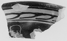 The head and a little of cloak of a draped male figure, left; around his head a white fillet with point at front.