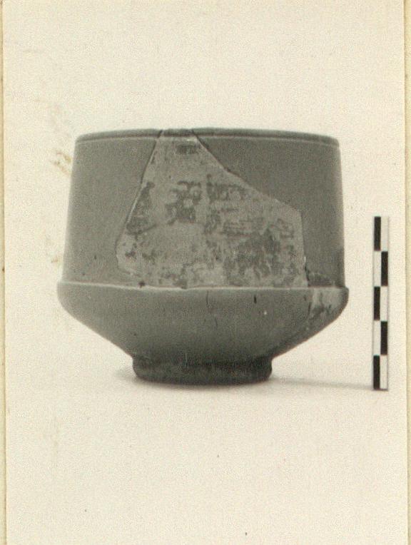 | Description: | Two joining fragments and one non-joining preserve complete profile. Restored in plaster (handles restored on basis of P 21733 and P 9150). Shallow body on false ring foot; the slightly concave base marked by two concentric grooves. High vertical rim set in from the top of the wall. Soft, orange-buff clay; dull reddish glaze on exterior and on inside of rim at top; most of interior unglazed. | |