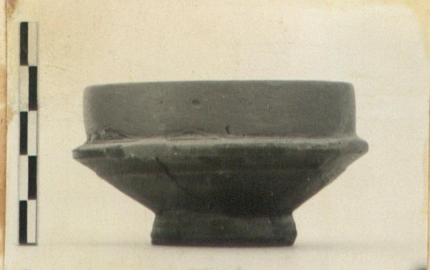 | Description: | All of rim and part of wall missing; restored in plaster on basis of P 9171. Small bowl or cup on ring foot. Wall flares in almost straight line from foot to rim. Vertical rim offset from wall by a projecting keel. Good buff clay; thin reddish to brownish glaze over all. | |