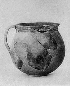 | Description: | About one-third of body circumference preserved; foot and lower wall missing. Restored in plaster on basis of P 16089. Globular body on false ring foot. Lip flares outward and is set off from body by an angular ridge. Single vertical handle from point of maximum diameter to b ase of lip. Three faint grooves around body in the handle zone. Rather coarse, brittle reddish clay; thin fabric; fired black on exterior. | |
