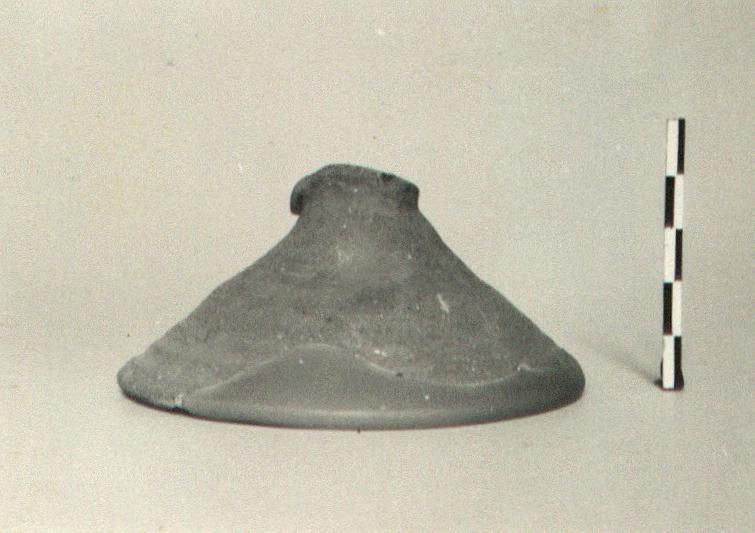 | Description: | About one-third of lip missing; restored in plaster. Small lid of conical shape with low knob, flat on top. Orange-buff clay with some mica; self-surfacing. Unglazed. | |