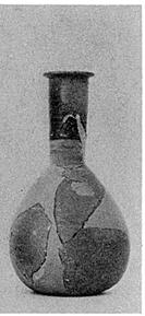 | Description: | Neck and few fragments of body preserved; profile complete except for center of base; restored in plaster. Globular body with flattened base; high narrow neck with small projecting horizontal lip. Hard reddish clay fired gray at core. Reddish to black glaze inside lip and on upper half of neck. | |