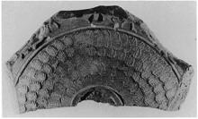 | Description: | Broken all around. About half of bottom and lower zone preserved; medallion missing. Small imbricated leaves in lower zone; feet of goats on broken edge above. Clean pinkish-buff clay. | |