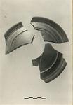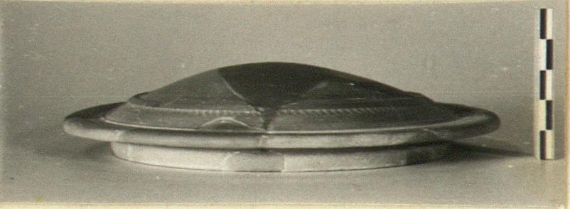 | Description: | Several joining and non-joining fragments mending to three, preserve about half the lid, lacking center portion and handle(?). Restored without handle. A domed lid with projecting horizontal rim; underneath, a vertical flange. A raised ridge at inner edge of rim, and another 0.01m. higher up. Rouletting on rim and below the upper ridge. Fine hard reddish clay. Good semi-lustrous orange-red glaze on top surface only. African Red Slip Ware. | |