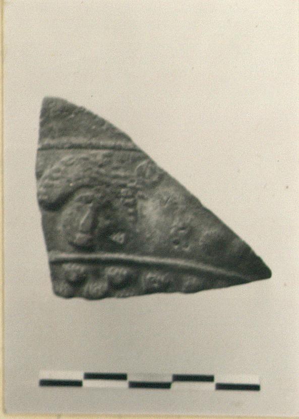| Description: | Wall fragment broken all around. On the wall, a large mask with a daisy chain leading off to another(?). Raised band above and below; scale pattern below lower band. Dull brown glaze. Non-Attic. | |