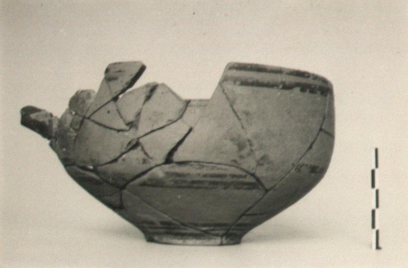 | Description: | Many joining fragments preserve most of a deep bowl with straight rim and small ring foot. Two concentric circles incised on bottom under foot. Horizontal rolled handle. Orange glaze on rim, and on body in bands: one below rim, three at middle, and three at base. Handle glazed. Pinkish-buff clay with creamy polished slip. ADDENDA Fragments broken off and stored inside the pot. | |