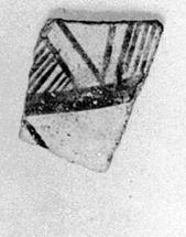 Description:   Matte-painted decoration. Broken all around. Preserves small fragment of wall of vessel, with hatched triangles above dark band in brown paint on dull greenish surface.