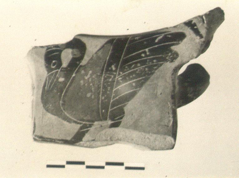 | Description: | Handle plate from kolumn krater. Swan, left, on top. Incision for details. Added red for dots on neck and breast, and for much of wing. Pinkish-buff clay. Glaze fired red to black. | |