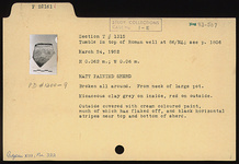| Description: | Broken all around. From neck of large pot. Micaceous clay gray on inside, red on outside. Outside covered with cream-colored paint, much of which has flaked off, and black horizontal stripes near top and bottom of sherd. Matte-painted decoration. Middle Helladic. | |