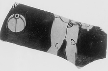Mid-part of a youth with strigil; at left a small aryballos corded for carrying; the fingers of a hand above.