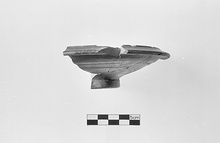 | Description: | Part of floor, rim and base preserved; profile complete except for center of floor. Ring foot; projecting rim, sloping downwards, its top surface slightly concave. Dull black to brownish glaze; center of floor and space inside foot fired red. Cf. P 26157. | |
